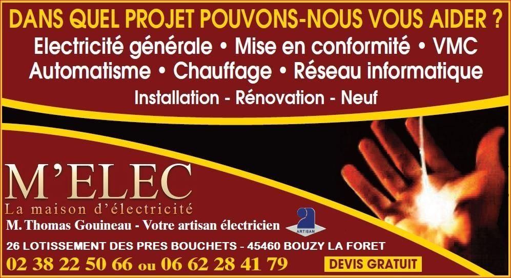 L’entreprise M'ELEC est spécialisée dans le domaine de l’électricité générale, en neuf et en rénovation. Situés à Saint-Jean-de-Braye près d'Orléans dans le département du Loiret (45), nous nous déplaçons à votre domicile pour la réalisation de toutes vos installations électriques, les remises aux normes et toutes les interventions dans les domaines de la ventilation, du chauffage, de l'automatisme et du réseau informatique. La volonté de notre artisan électricien est de vous offrir un travail soigné et de qualité aussi bien dans le neuf que dans la rénovation, et ce dans les meilleurs délais.